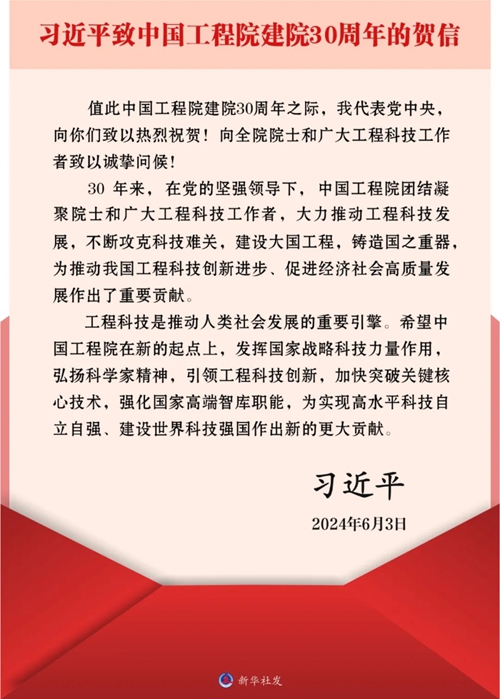 新華社北京6月3日電 在中國工程院建院30周年之際,中共中央總書記、國家主席、中央軍委主席習近平發來賀信,代表黨中央致以熱烈祝賀,向全院院士和廣大工程科技工作者致以誠摯問候。