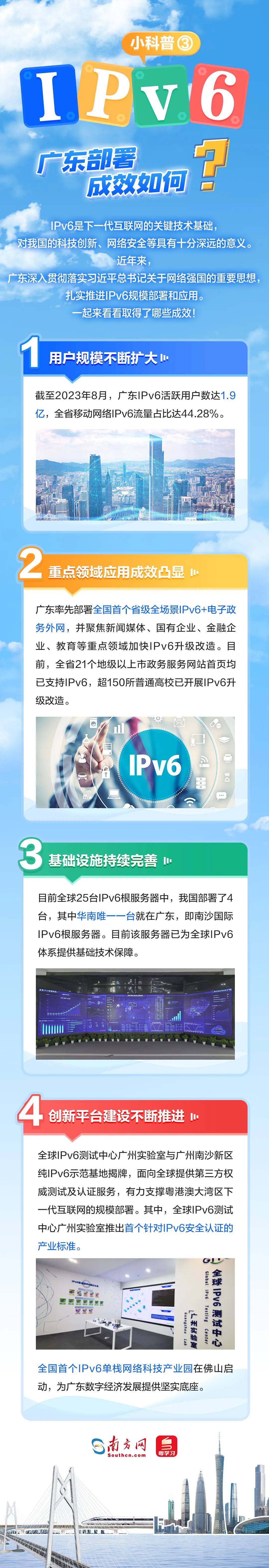2024年是習近平總書記提出網絡強國戰略目標10周年,也是我國全功能接入國際互聯網30周年。作為下一代互聯網的基礎,IPv6的規模部署和應用是網絡安全能力強化的迫切需要,可為網絡強國建設提供有力支撐。近年來,廣東IPv6規模部署取得良好效果,積極賦能千行百業加快形成新質生產力。