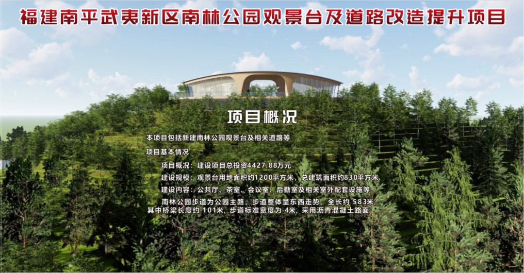 南林公園觀景臺及道路改造提升項目本項目包括新建南林公園觀景臺及相關(guān)道路等。建設(shè)項目總投資4427.88萬元。建設(shè)規(guī)模為觀景臺用地面積約1200平方米,總建筑面積約830平方米,建設(shè)內(nèi)容包含公共廳、茶室、會議室、后勤室及相關(guān)室外配套設(shè)施等;南林公園步道為公園主路,步道整體呈東西走勢,全長約 583m,其中橋梁長度約 101m,步道標(biāo)準(zhǔn)寬度為 4m,采用瀝青混凝土路面。